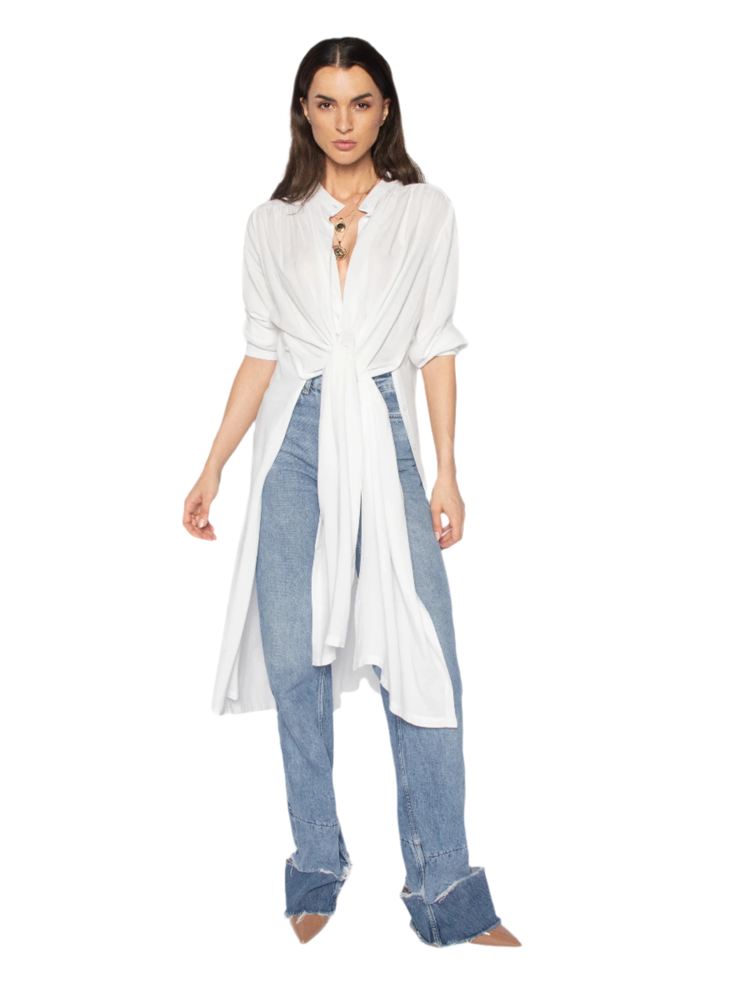 Cămașă lungă albă, cu croi lejer și închidere cu nasturi. Poate fi purtată deschisă, legată în talie sau ca rochie, pentru un look relaxat, dar sofisticat....
