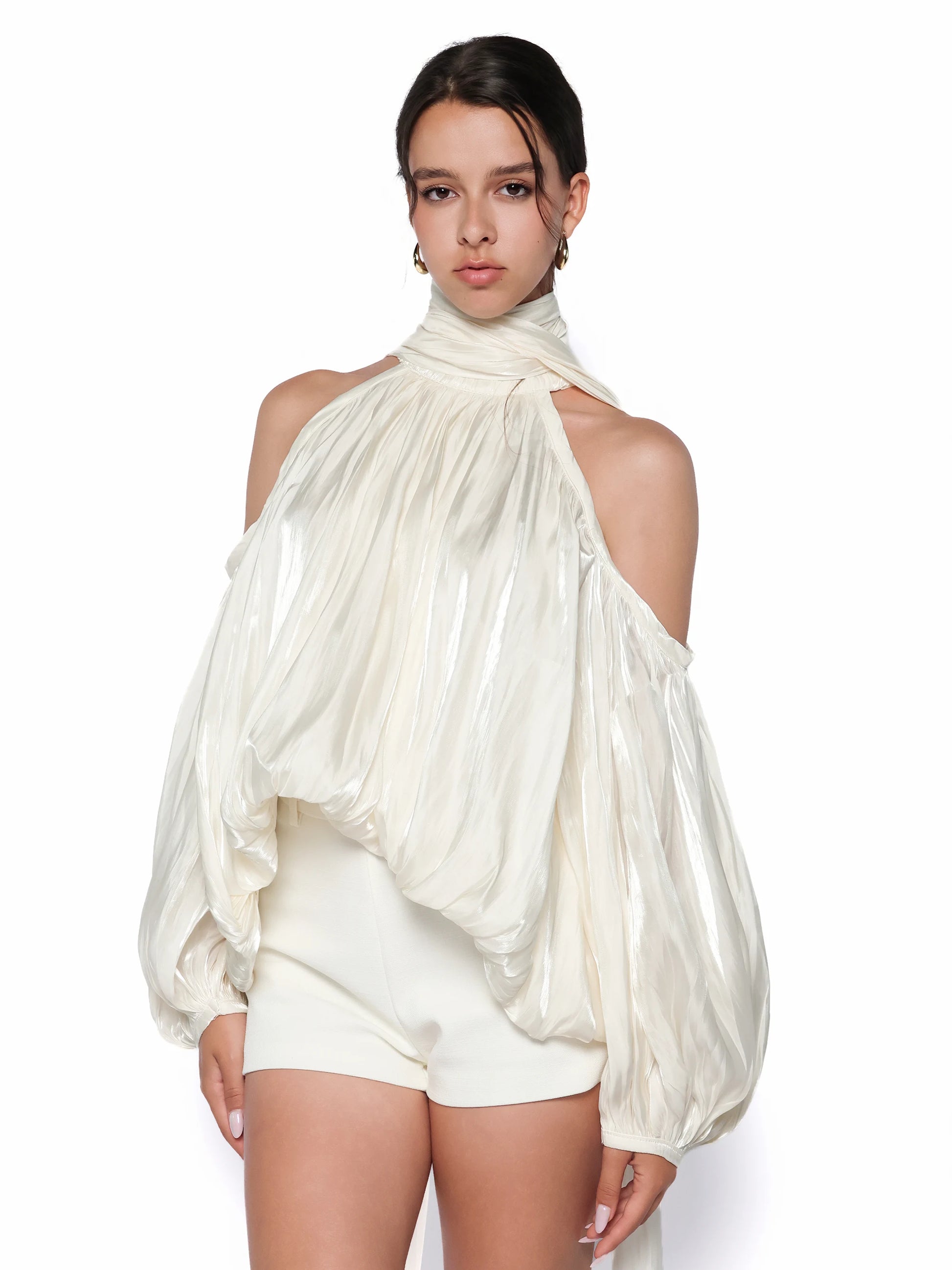 Un aer couture care se simte din prima clipă. Bluza Valeria îmbină eleganța teatrală cu delicatețea unei atingeri fine. Cu umerii goi și volumul amplu al mânecilor, e o piesă statement care nu are nevoie de introducere. Gulerul înalt, ce se leagă la spate, creează o linie regală, iar textura perlată transformă orice lumină într-un detaliu de efect.