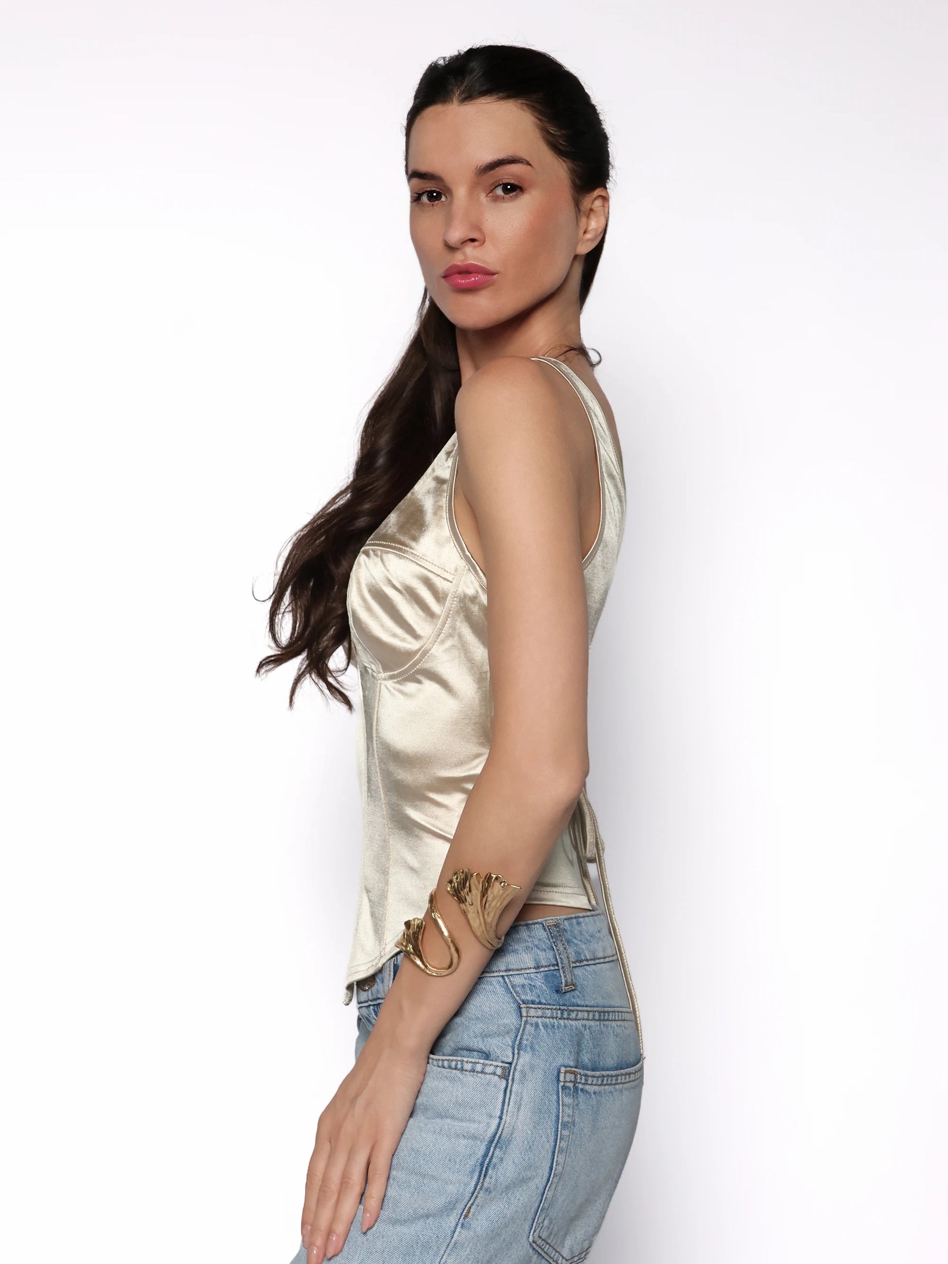 Daca vrei un top care sa intoarca toate privirile, Evelyne este alegerea perfecta. Corsetul din satin bej sidefat are un decolteu in V adanc si cupe care ofera sustinere si contur, fiind gandit sa flateze bustul si talia. Cusaturile verticale creeaza efectul de silueta clepsidra, iar inchiderea cu snur la spate iti permite sa-l reglezi perfect pe corpul tau. Este sexy, rafinat si perfect pentru o iesire de seara, un party sau chiar un festival de vara. Asorteaza-l cu o pereche de jeans si esti gata!