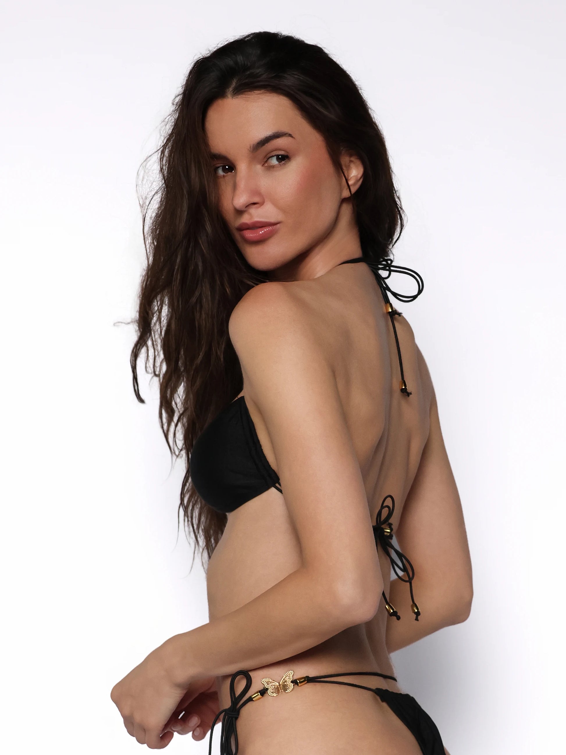 Un costum de baie negru cu detalii aurii in forma de fluture. Designul minimalist si sexy evidentiaza formele corpului, iar detaliile adauga o nota de eleganta si rafinament. Este alegerea ideala pentru o aparitie memorabila la piscina, pe yacht sau intr-o vacanta exotica.