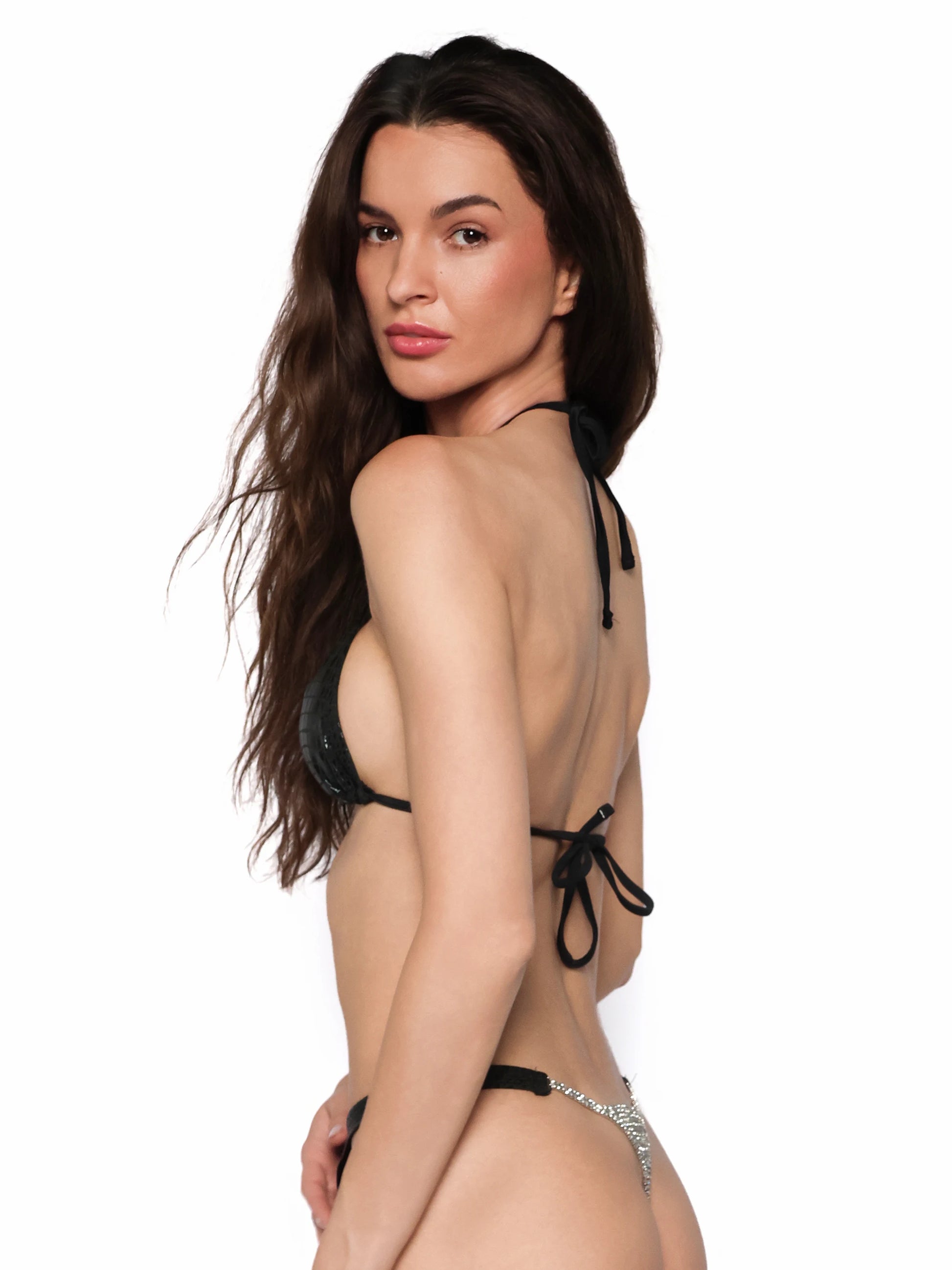 Partea de sus tip triunghi subliniaza bustul cu delicatete si ofera sustinere prin prinderea reglabila dupa gat si la spate. Partea de jos este un mix perfect intre indrazneala si rafinament: talie inalta, croi decupat si un element de bijuterie care garanteaza priviri.