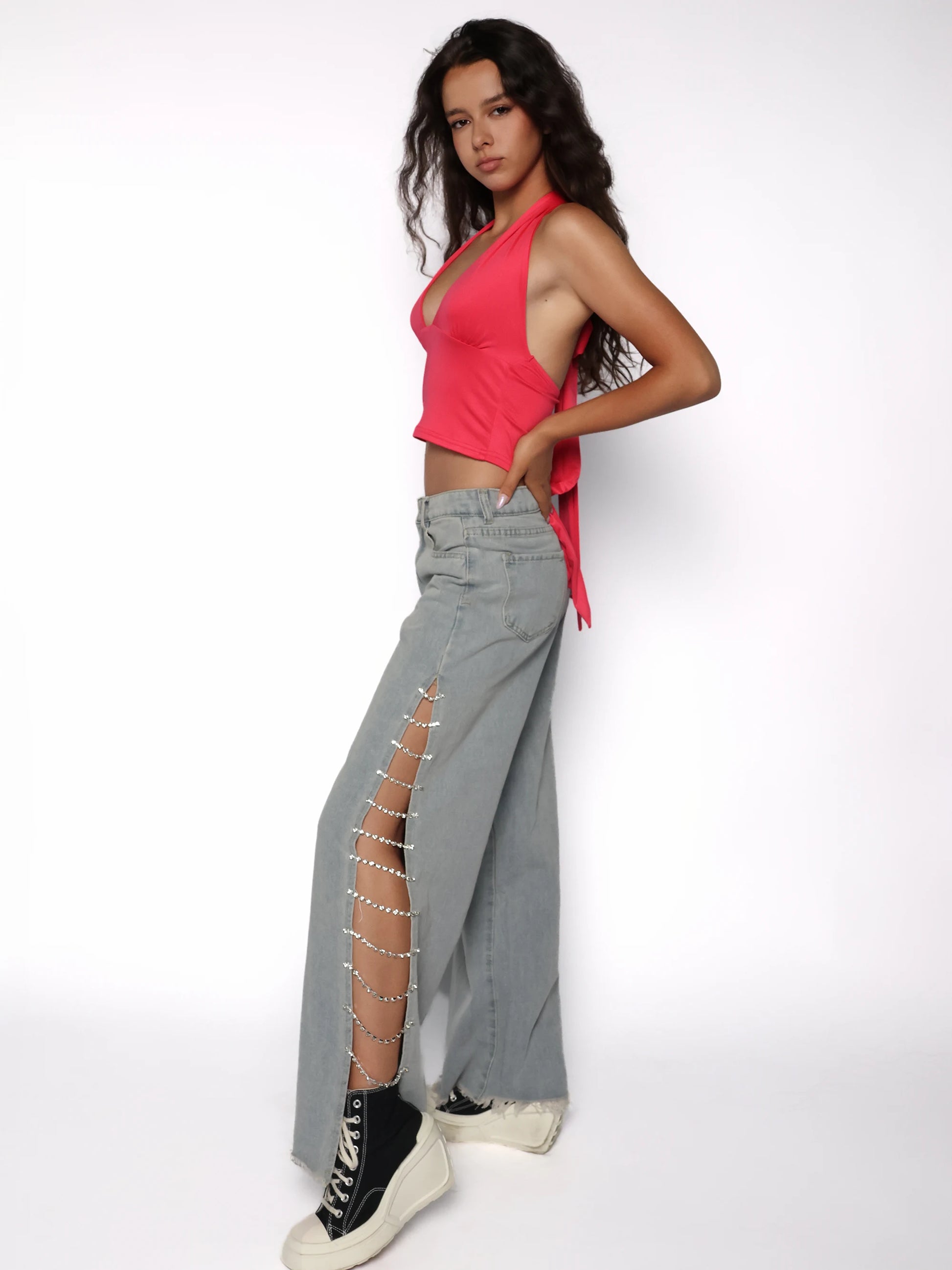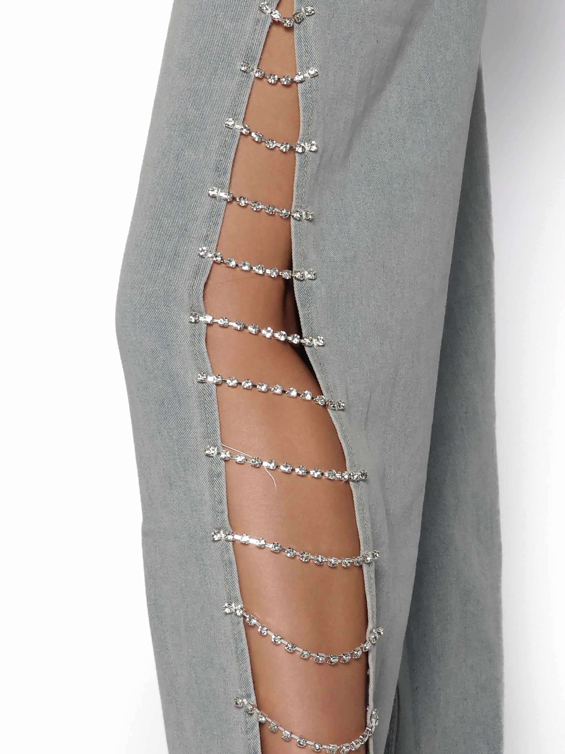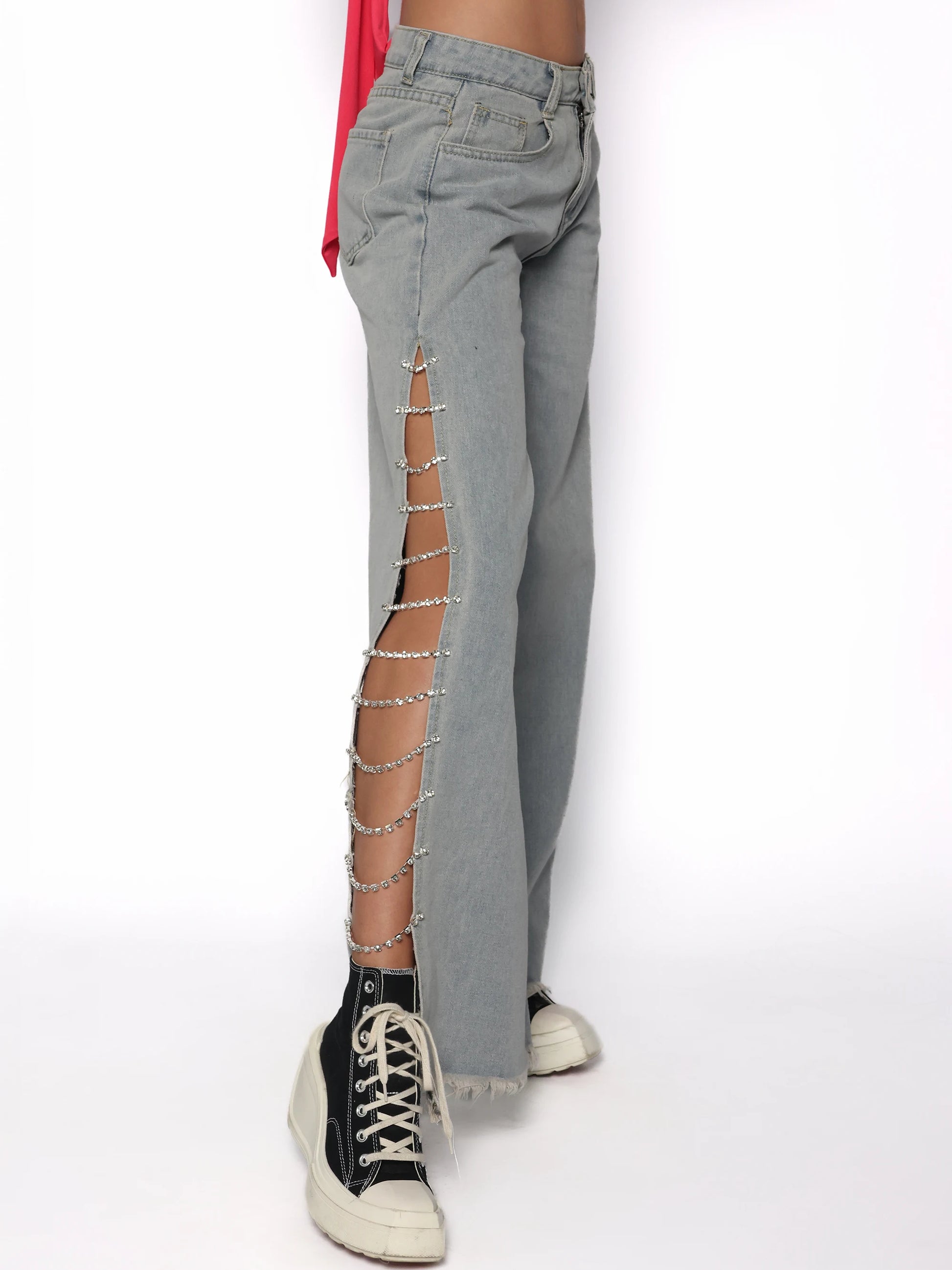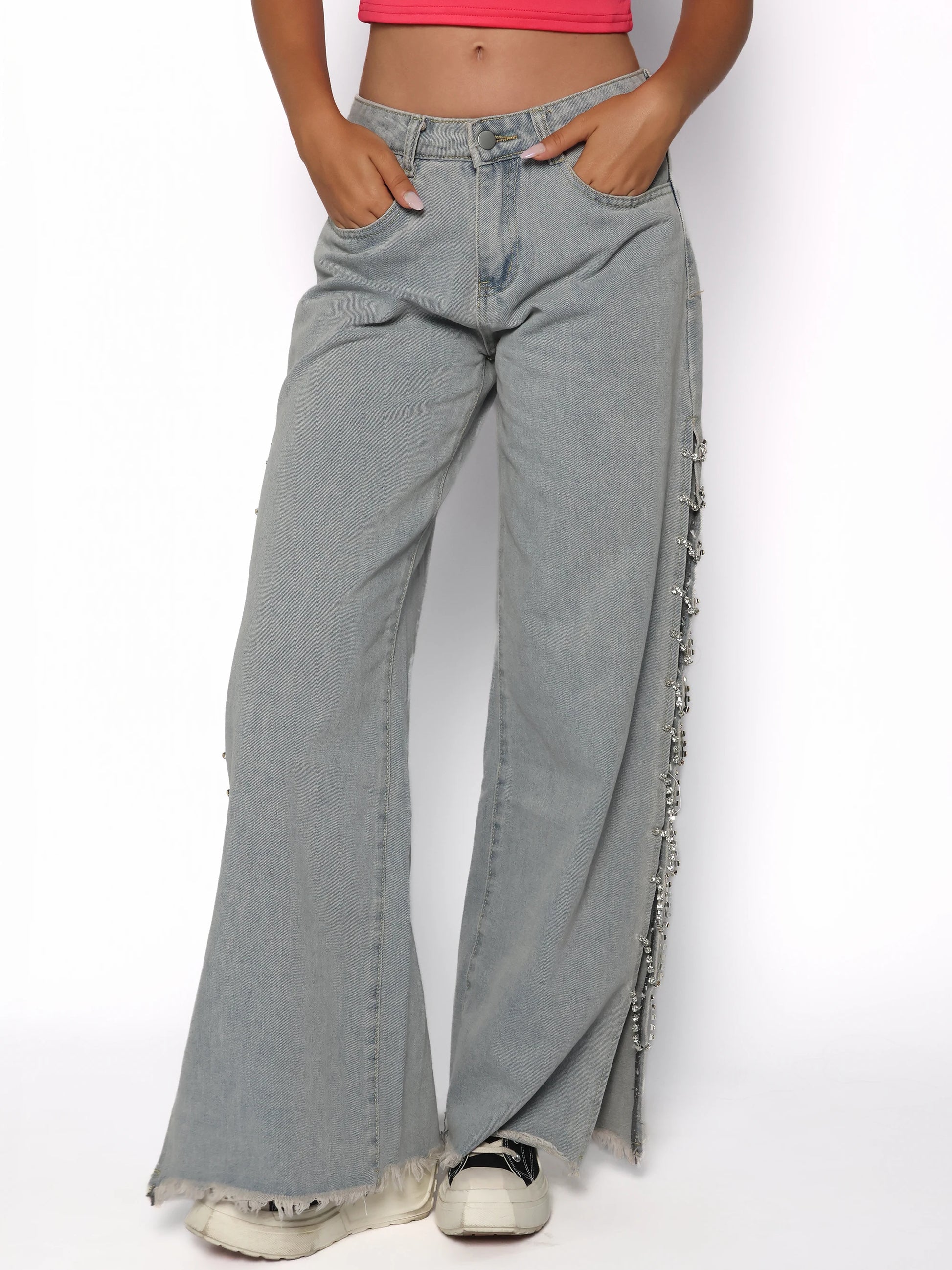 Pantalonii evazati din denim gri cu detalii laterale din lanturi cu pietre sunt piesa statement care transforma orice tinuta casual intr-una spectaculoasa. Croiala lejera si decupajele laterale evidentiaza silueta intr-un mod seducator, fara sa compromita confortul. Se inchid cu nasture si fermoar, iar tivul nefinisat adauga un touch rebel. Poarta acești blugi cu strasuri cu un top scurt si sneakersi pentru un look urban cu atitudine.