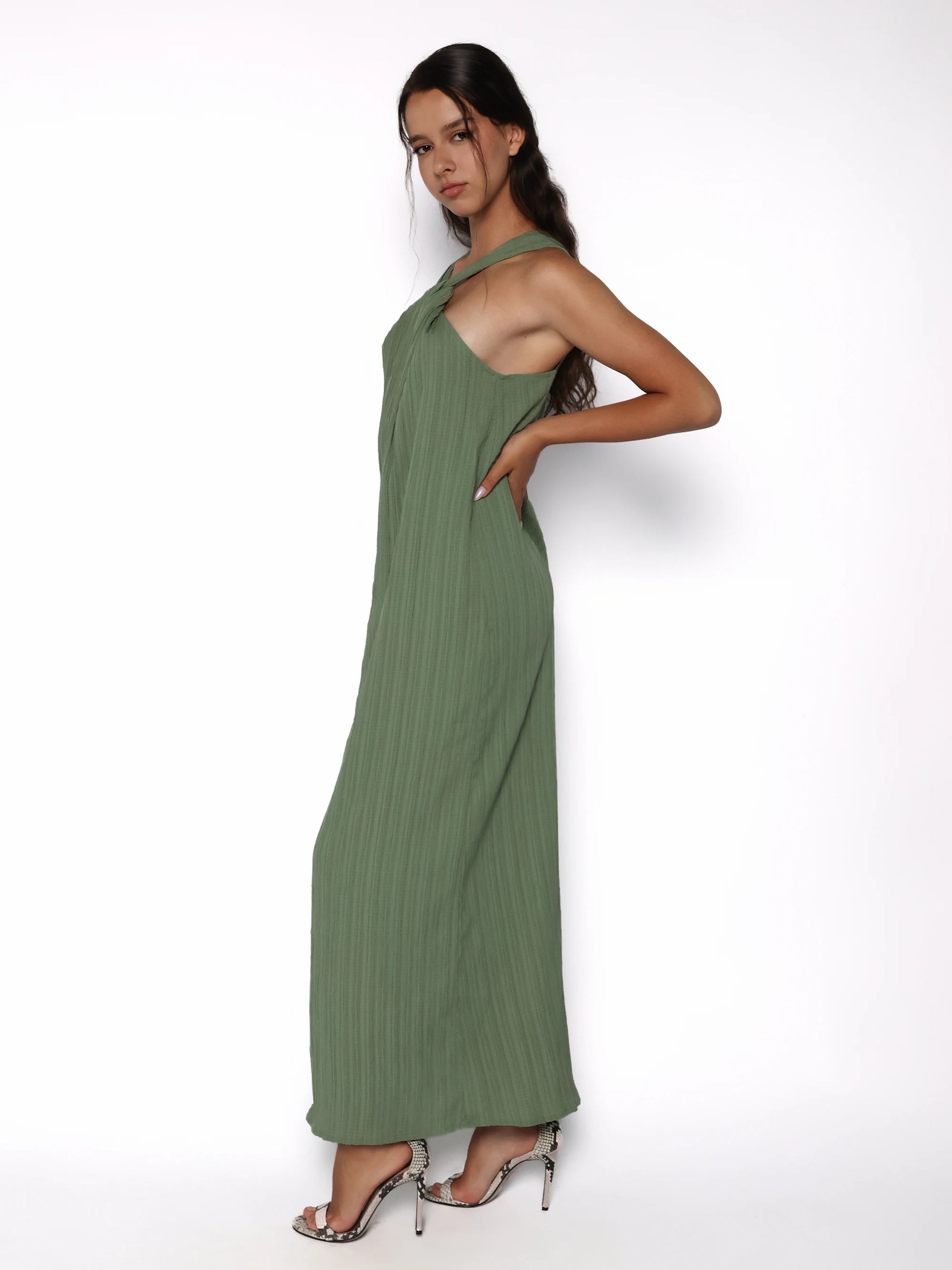 Aceasta rochie maxi este piesa must-have pentru vara. Croiul drept urmeaza delicat linia corpului, iar textura plisata a materialului creeaza un efect subtil, dar sofisticat. Materialul este usor, respirabil si se aseaza perfect indiferent de silueta. Detaliul din zona gatului pune in valoare umerii si aduce un aer rafinat, in timp ce lungimea maxi alungeste silueta si ofera un look elegant chiar si purtata cu sandale simple.