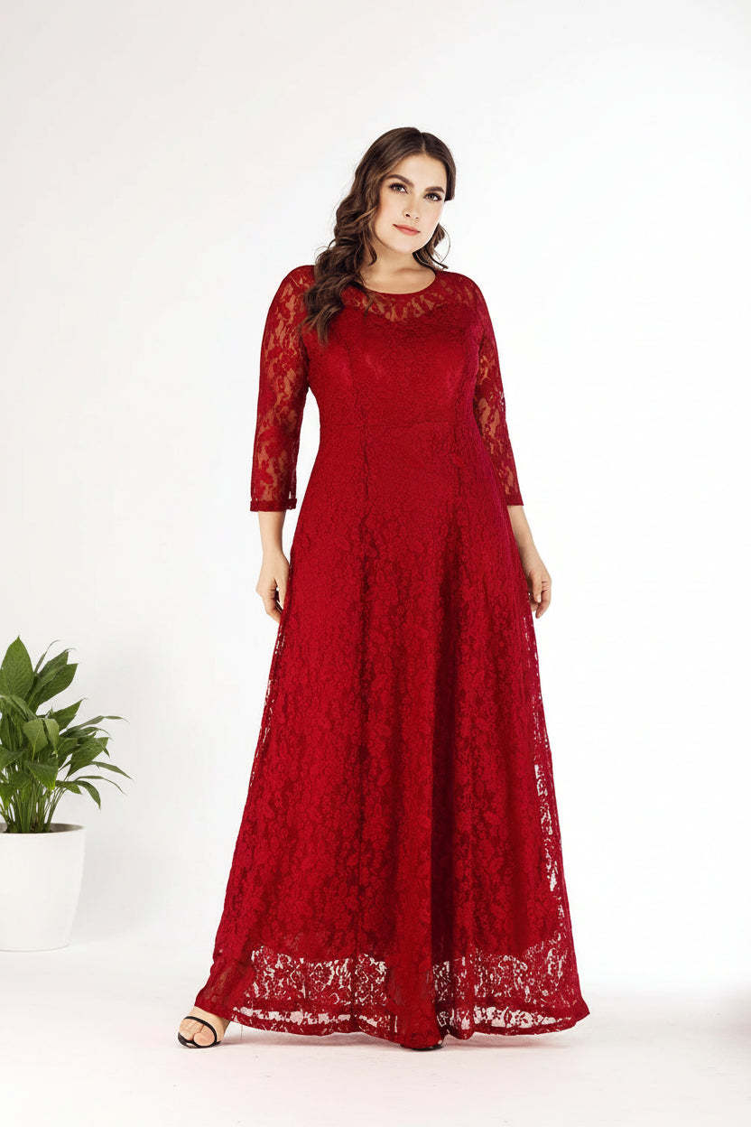 Rochie lunga din dantela elastica cu maneci trei sferturi si croiala in A, Sofia