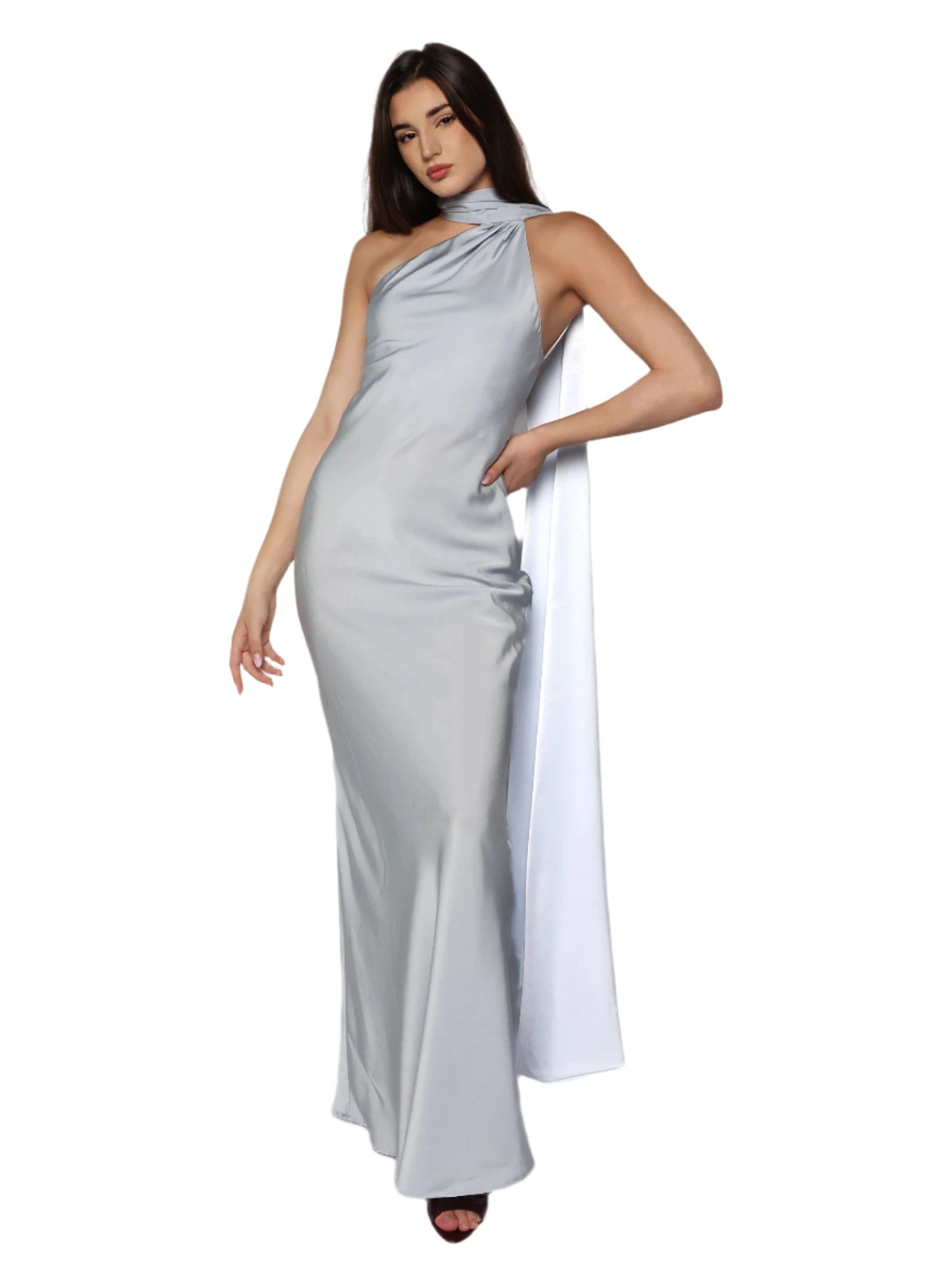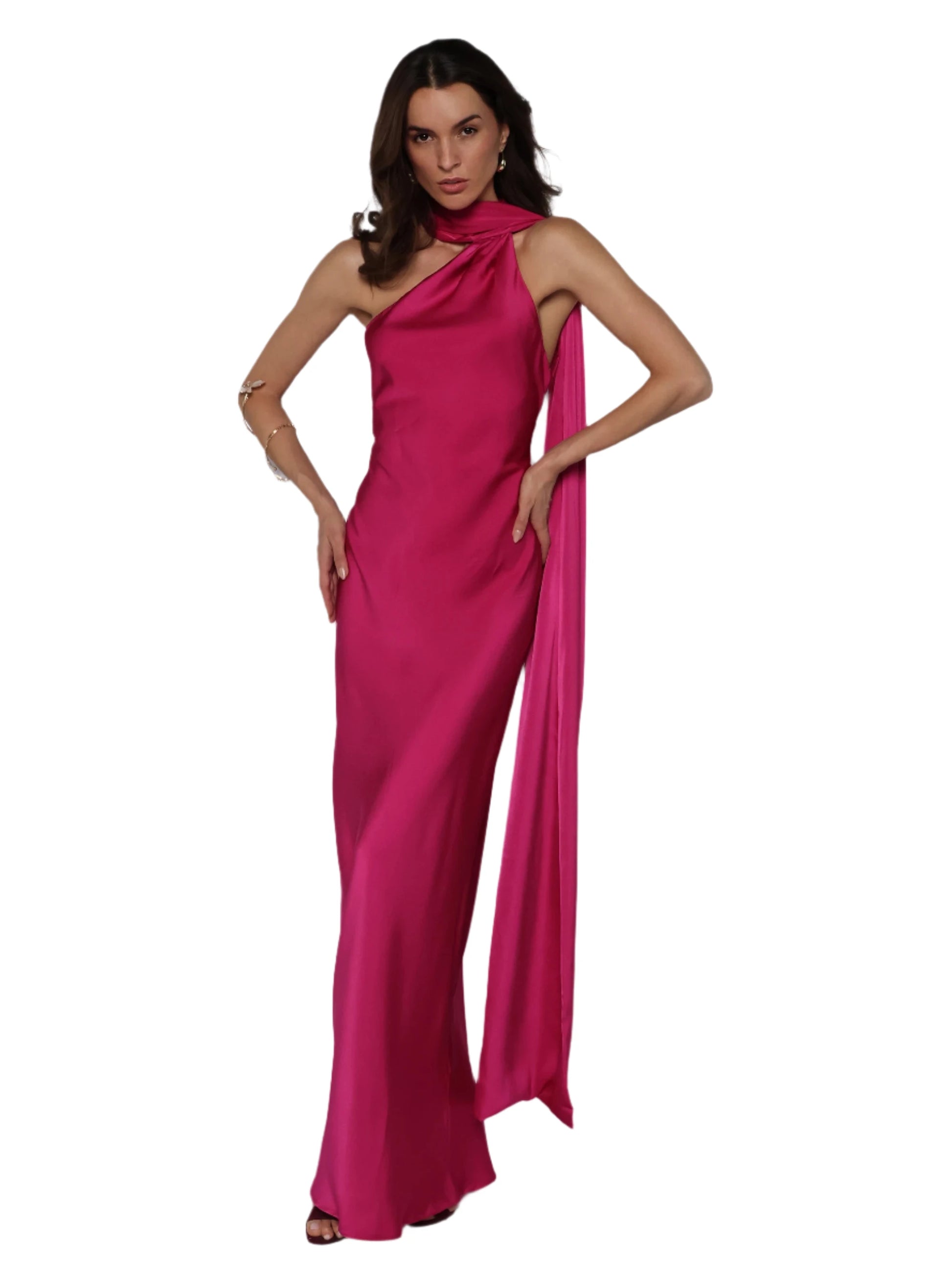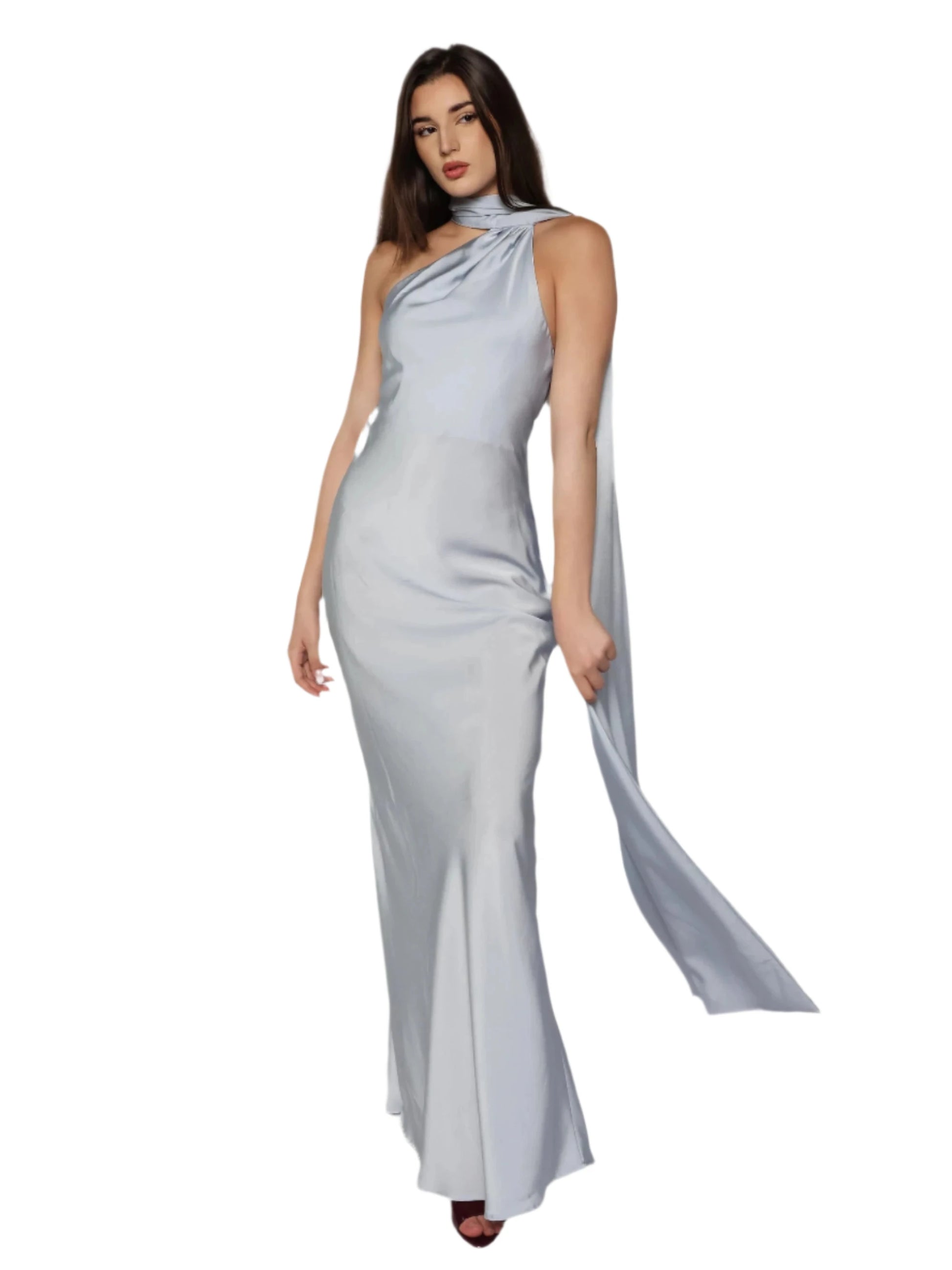 Aceasta rochie lunga, cu croi fluid si textura satinata, este piesa care transforma orice aparitie intr-o declaratie de rafinament. Cu un design pe un umar si esarfa lunga care cade lejer la spate, modelul Alma evidentiaza linia gatului si a spatelui, oferind un aer sofisticat si elegant. Perfecta pentru evenimente speciale, cine romantice sau momente in care vrei sa te simti ca o zeita moderna. Alege culoarea care iti reflecta starea de spirit si fa un catwalk cu incredere spre centrul atentiei tuturor.