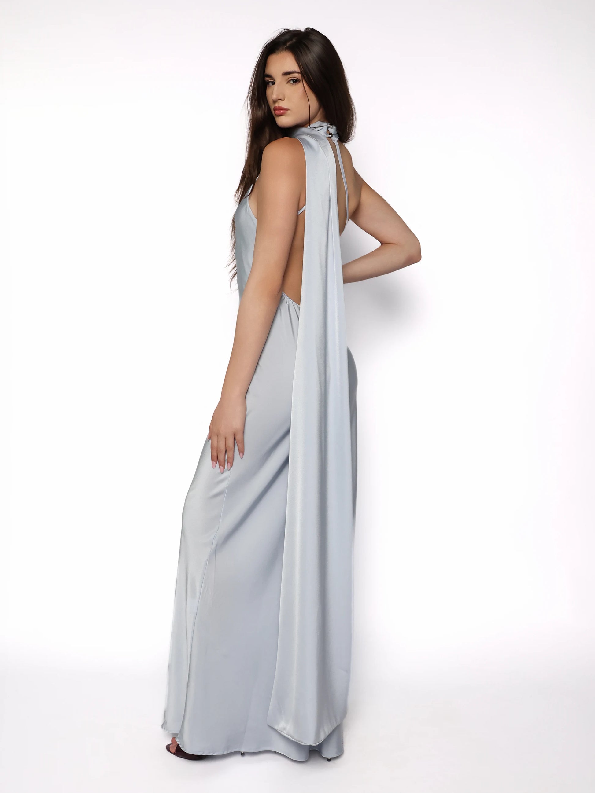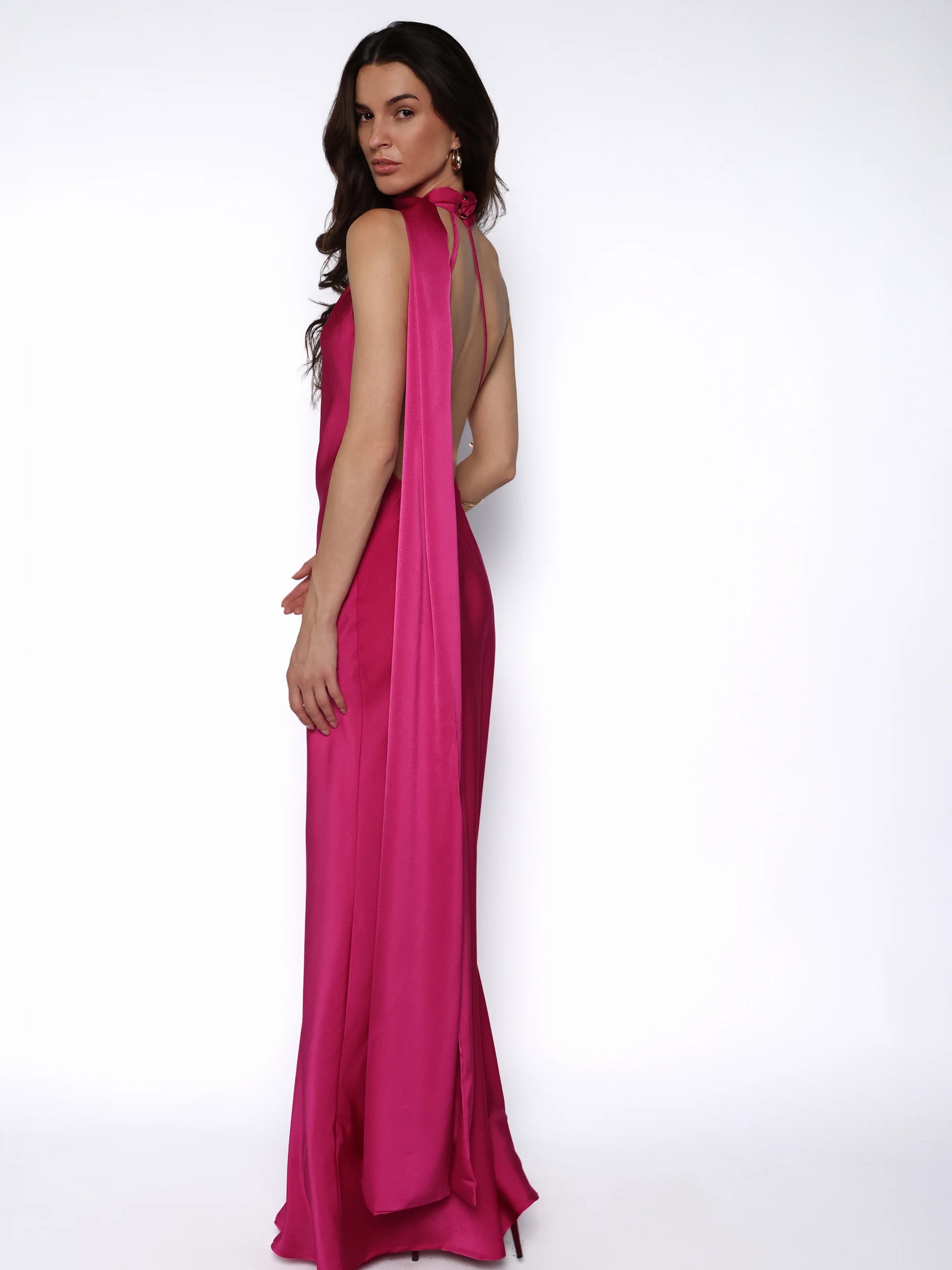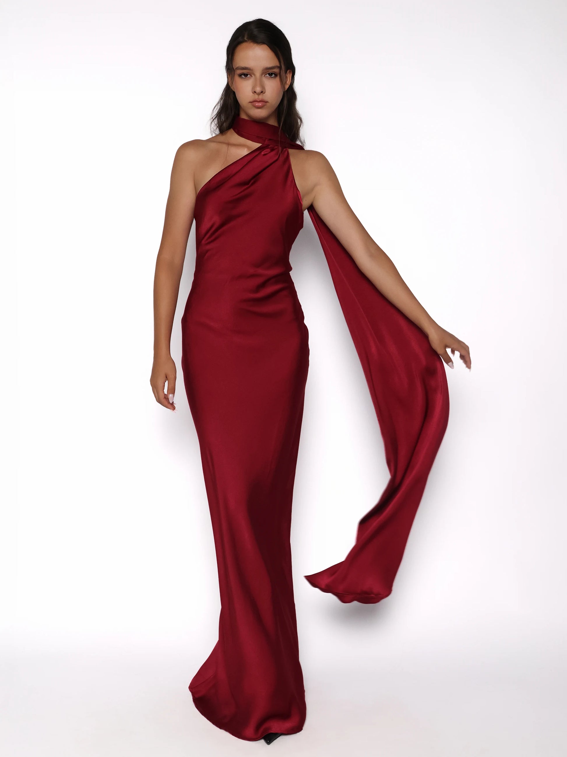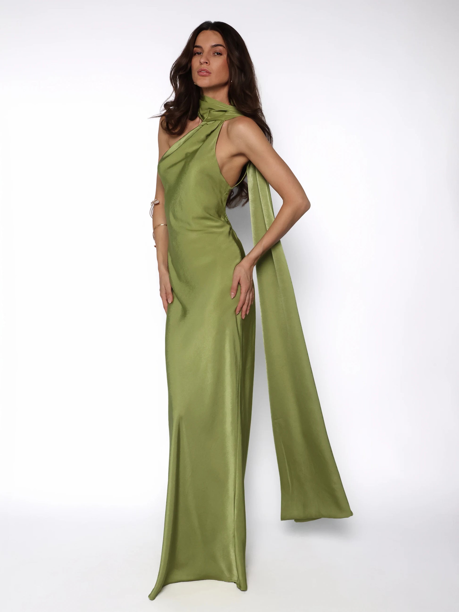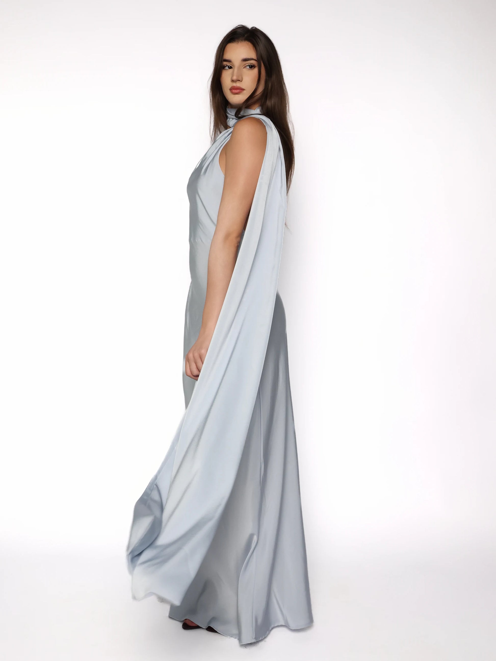 Rochie lunga satinata cu detaliu tip esarfa fluida, Alma