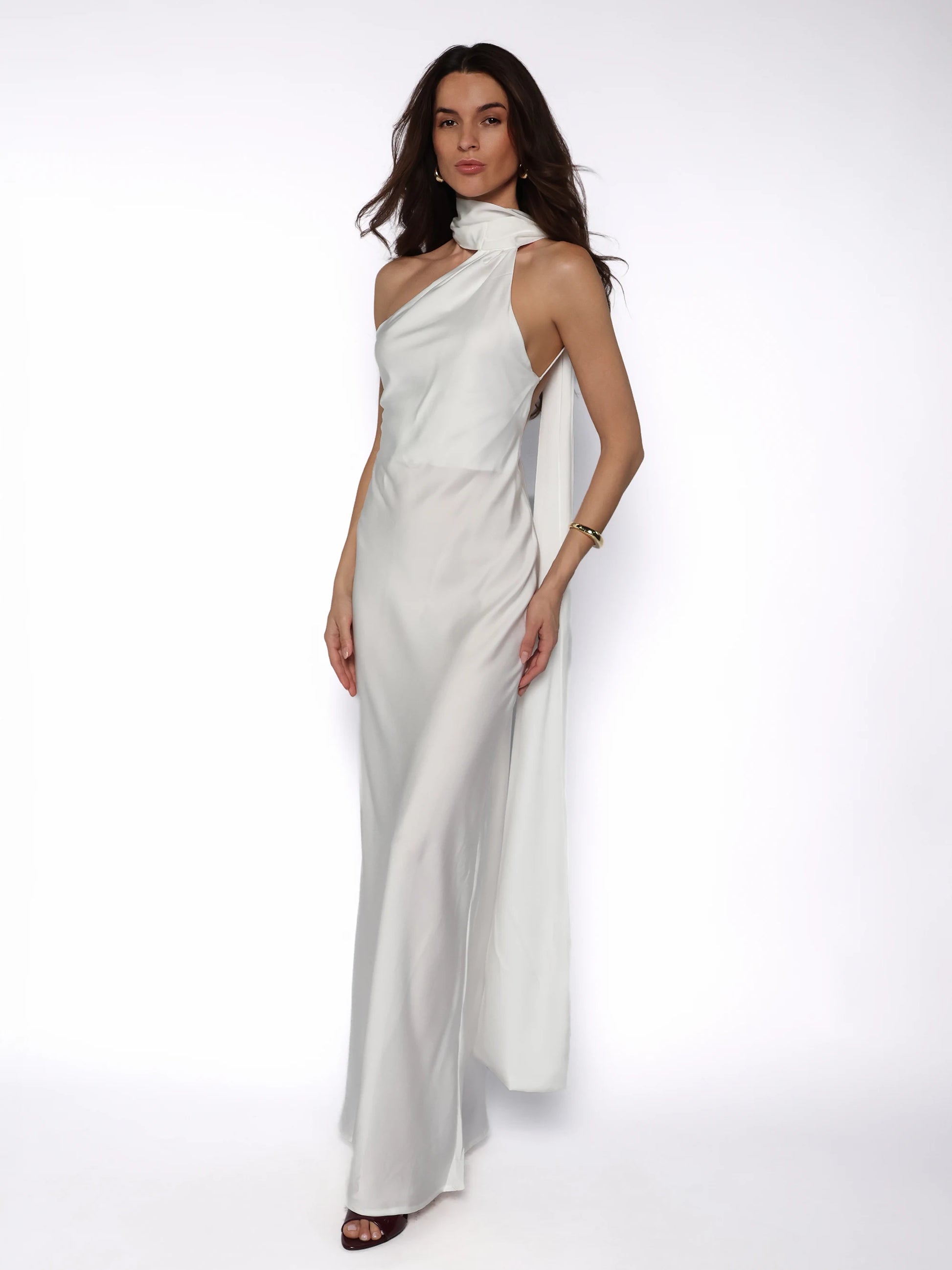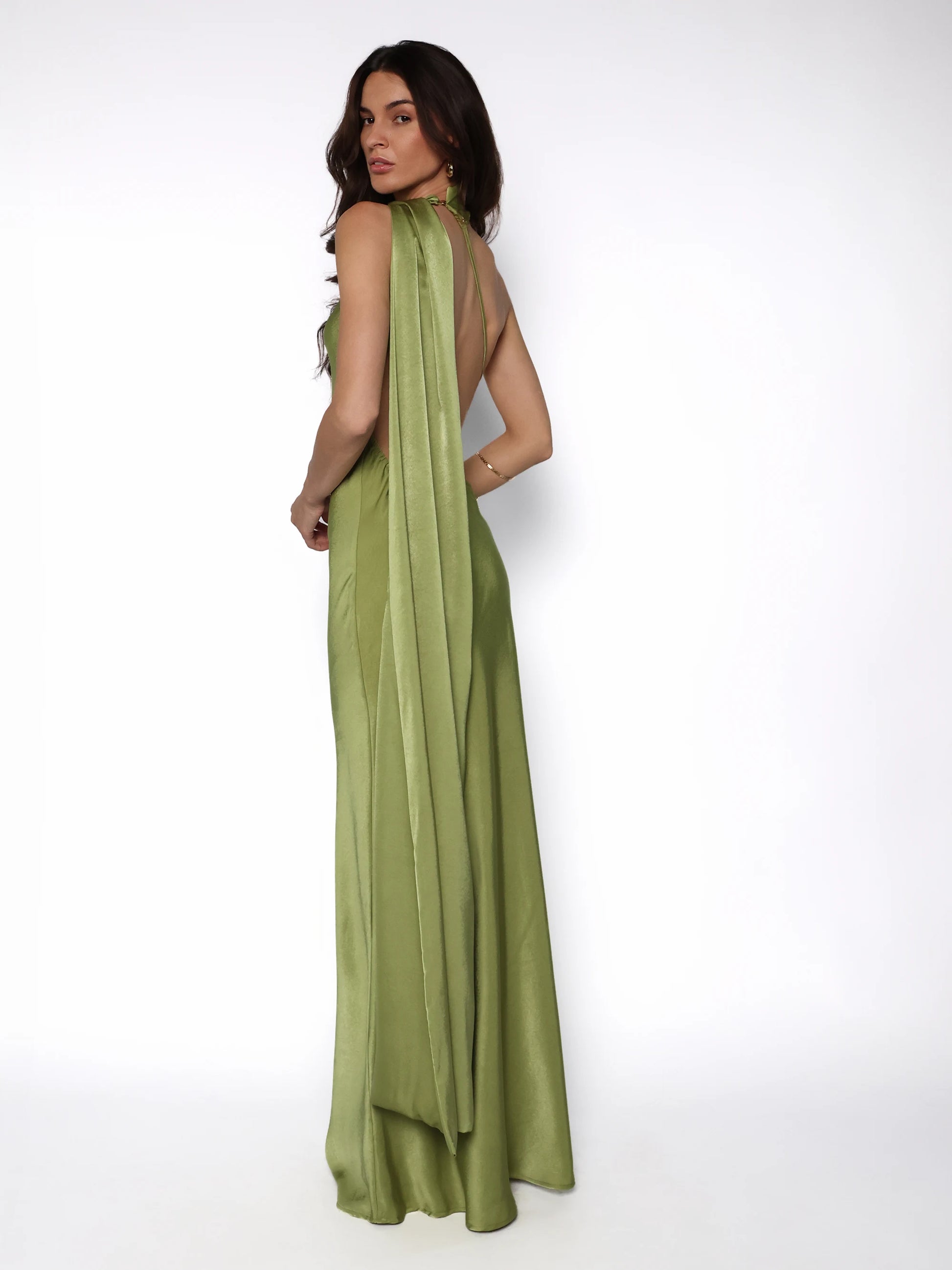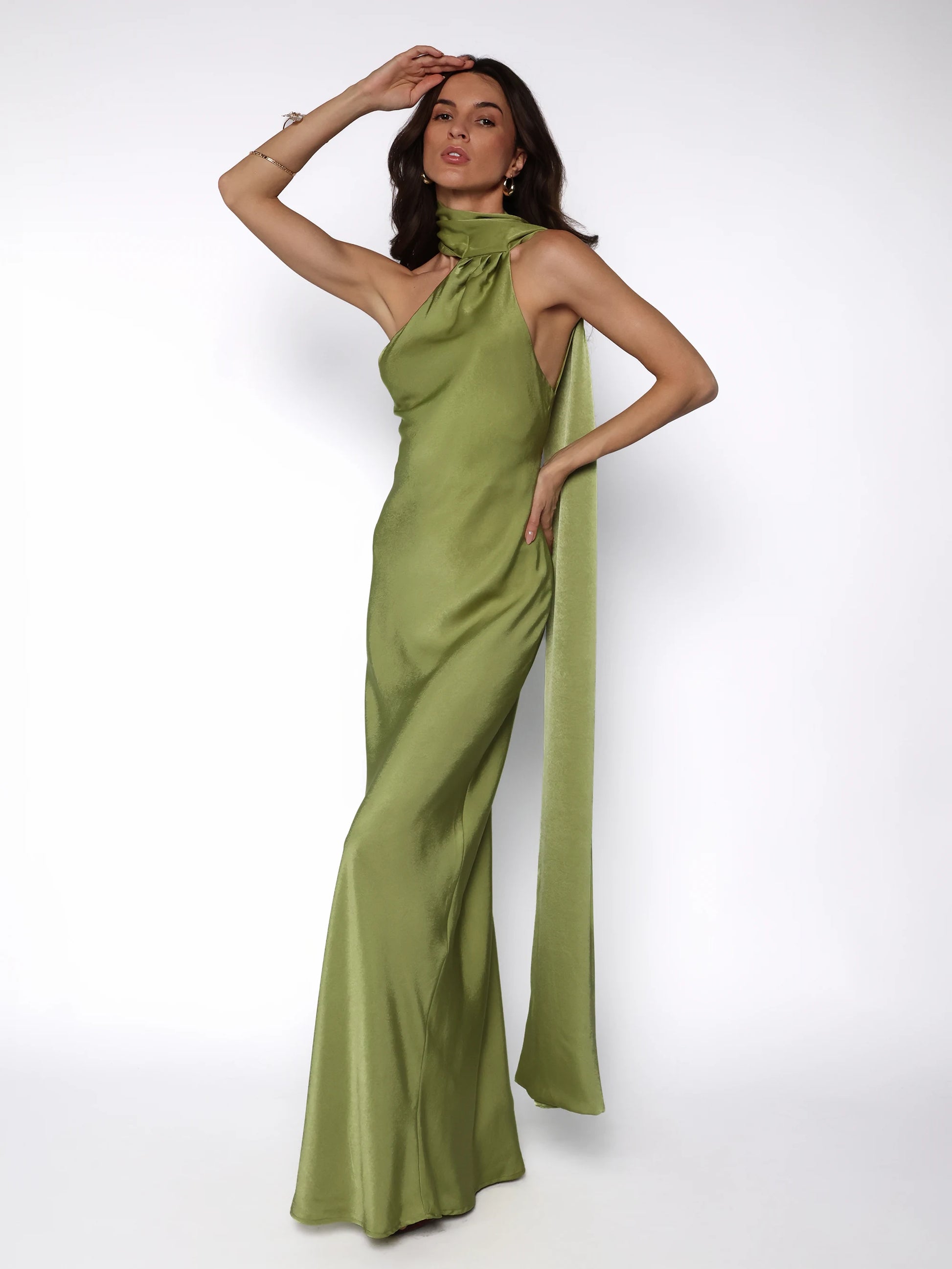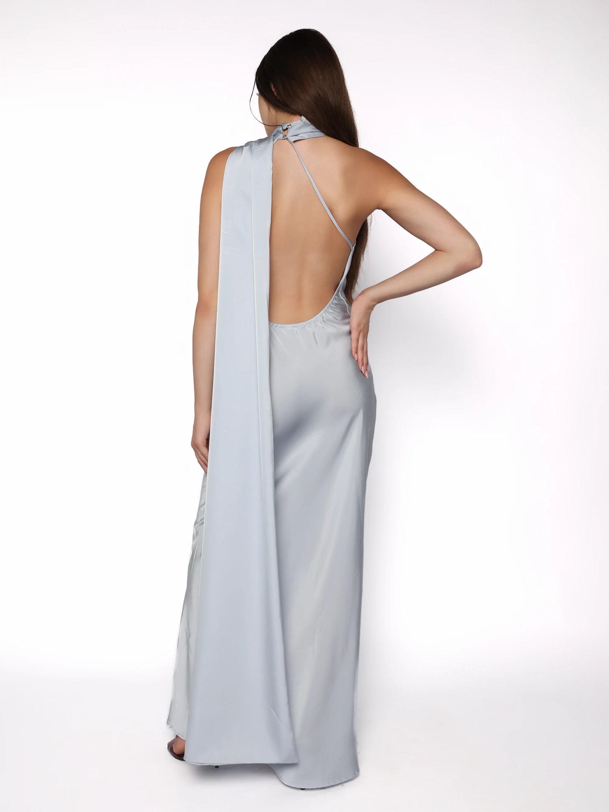 Rochie lunga satinata cu detaliu tip esarfa fluida, Alma