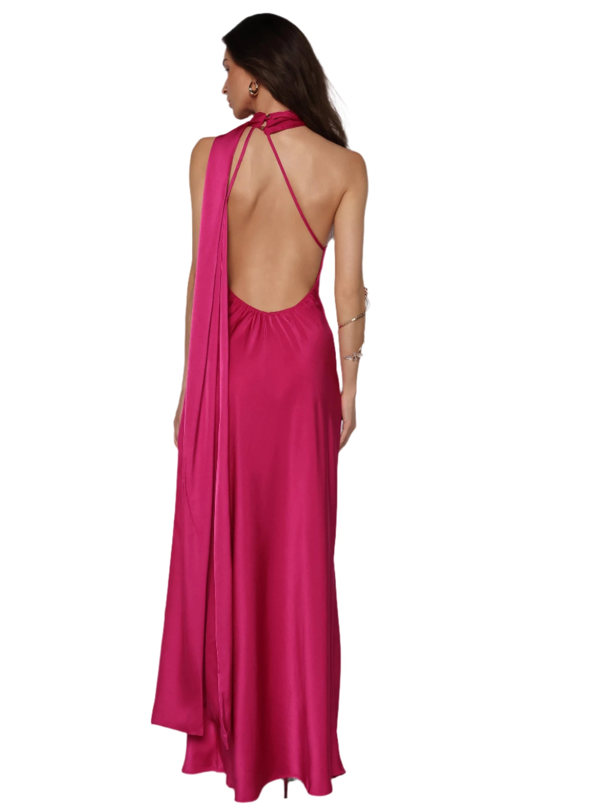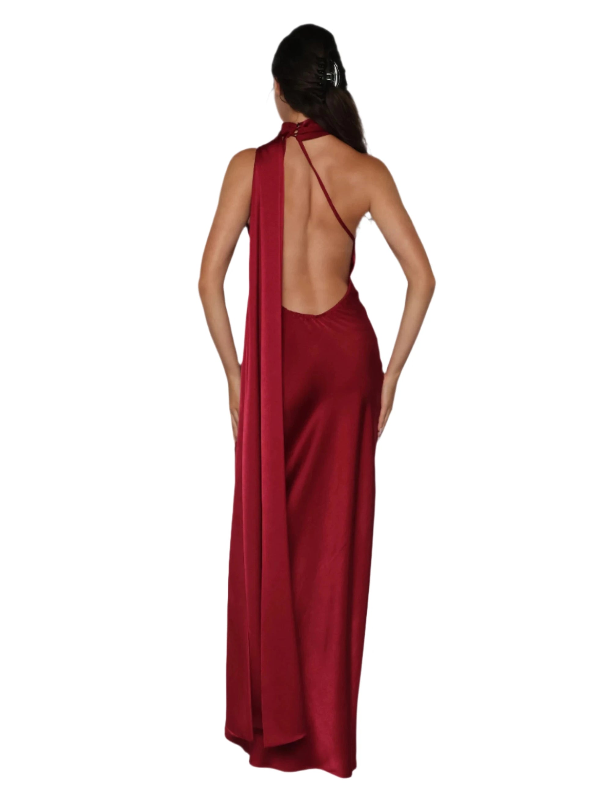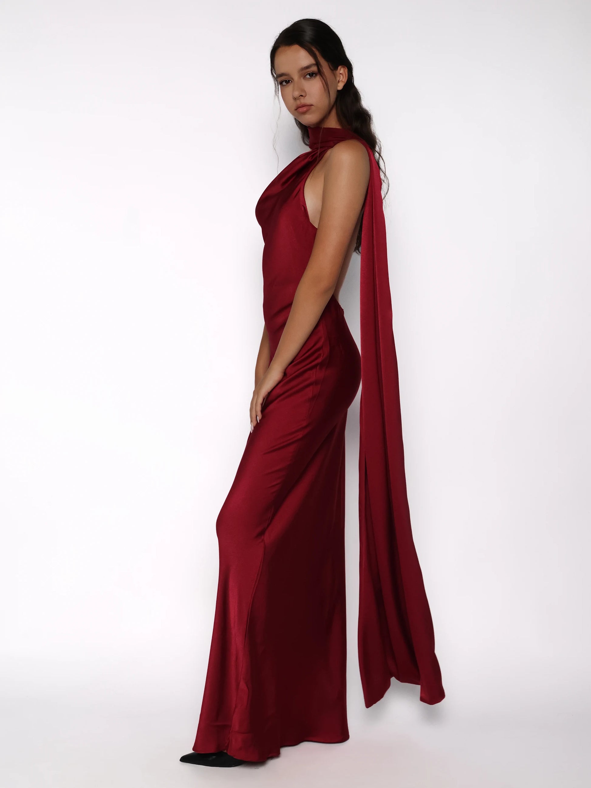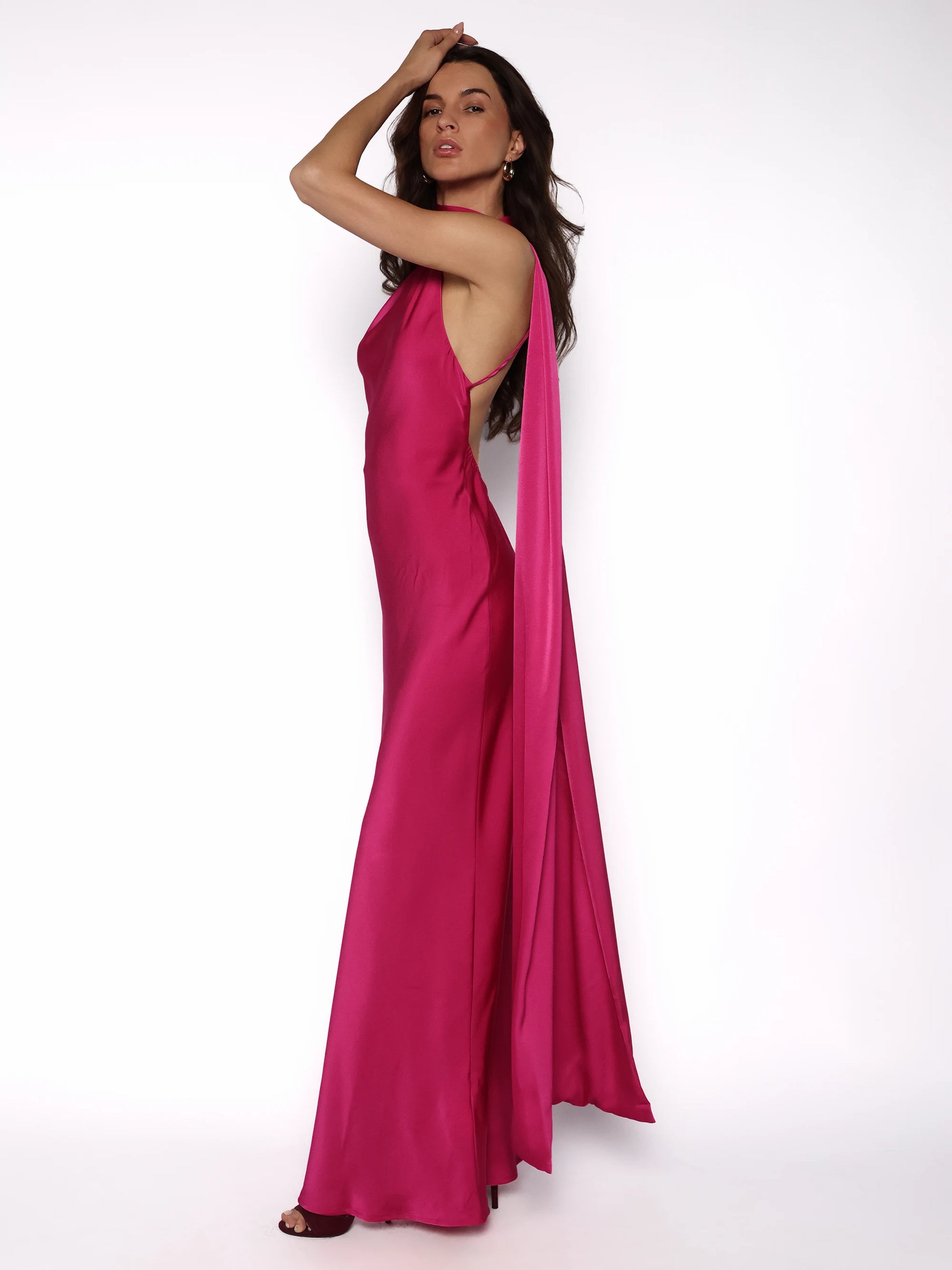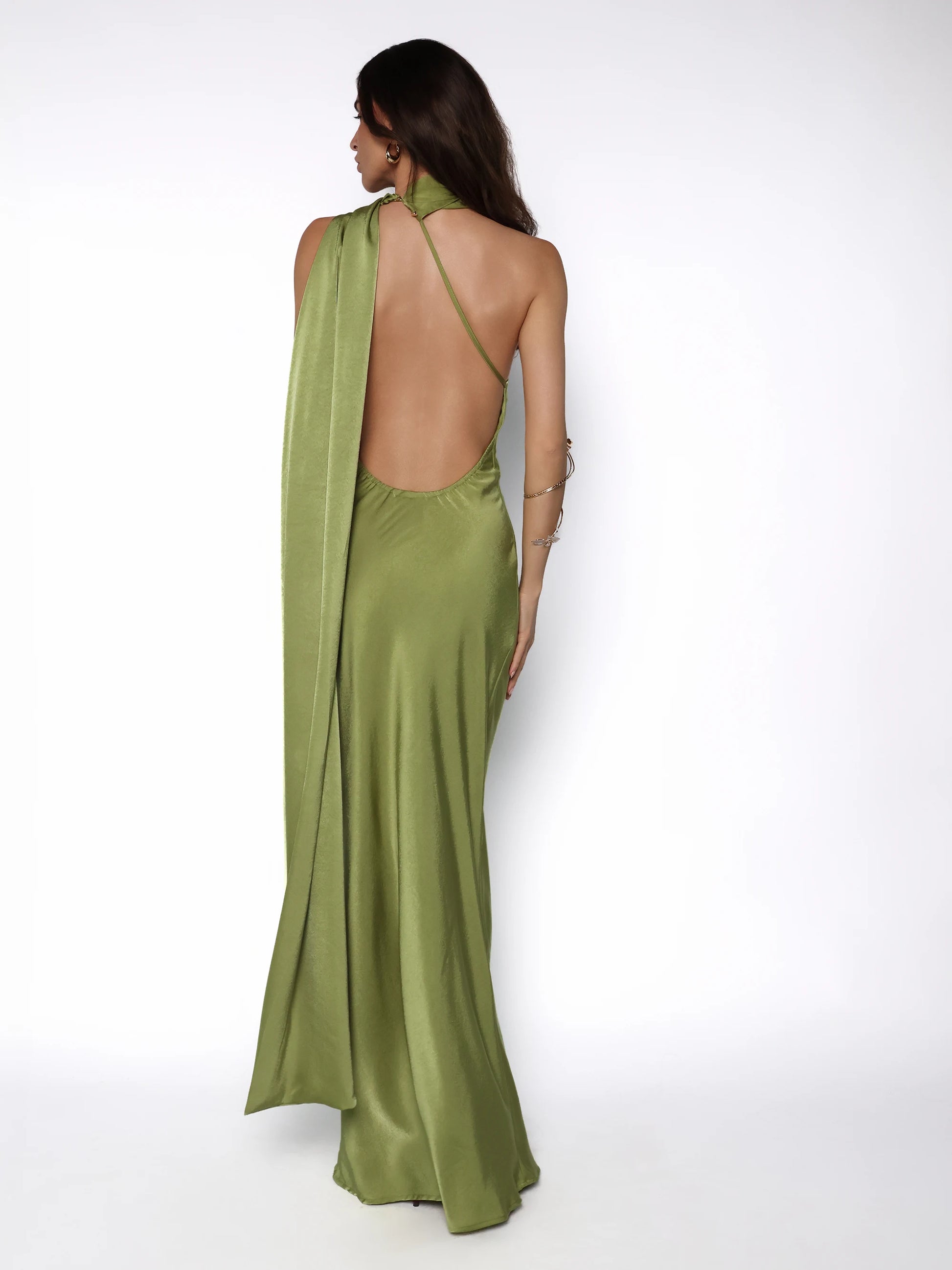 Rochie lunga satinata cu detaliu tip esarfa fluida, Alma
