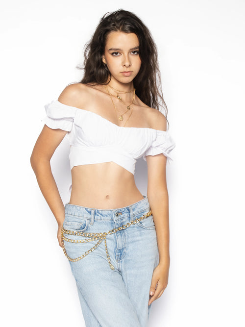 Top scurt cu umerii căzuți și mâneci bufante, confecționat din bumbac alb. Croiul evidențiază talia, iar spatele se închide cu o fundă amplă pentru un plus de farmec. Ideal pentru ținute casual cu un twist senzual și fresh.